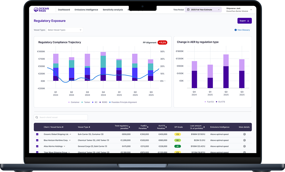 For Poseidon Principles-aligned banks, the OceanPass Bankers Module dramatically simplifies the complexity of annual data gathering and reporting—while laying the groundwork for a more dynamic, insight-driven approach to ship finance.